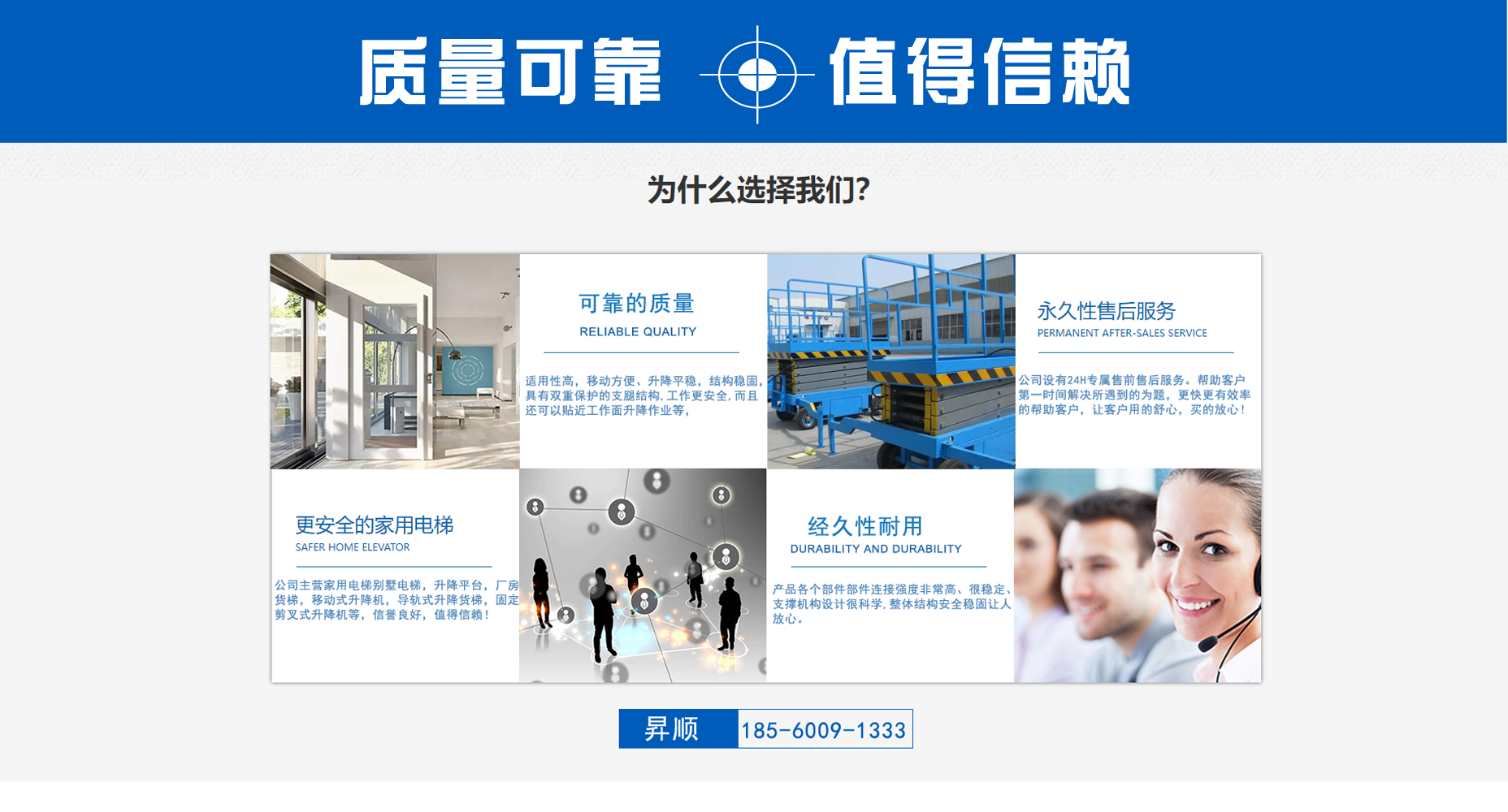 山東昇順液壓升降機(jī)械有限公司是一家主營(yíng)家用電梯,別墅電梯,升降平臺(tái),廠房貨梯,移動(dòng)式升降機(jī),導(dǎo)軌式升降貨梯,固定剪叉式升降機(jī)等產(chǎn)品企業(yè),質(zhì)量可靠,值得信賴?! ∮脩糁辽希杂脩魹橹行摹笔枪居肋h(yuǎn)堅(jiān)持的服務(wù)宗旨,贏得用戶的贊許是我們的榮譽(yù),及時(shí)滿足用戶的需求,是我們公司的愿望。長(zhǎng)期以來(lái),公司員工以優(yōu)質(zhì)的服務(wù),取悅于用戶,以誠(chéng)信的言行取信于用戶,得到了用戶們的好評(píng)。我們期待著與您更加愉快的合作!公司的發(fā)展,離不開社會(huì)的大力支持,在社會(huì)的支持和幫助下,我們正昂首闊步邁向未來(lái)! 我們的經(jīng)營(yíng)方針是:以質(zhì)量求生存,以產(chǎn)品求發(fā)展,以信譽(yù)保合作,以服務(wù)贏客戶?! ”竟緦?duì)產(chǎn)品質(zhì)量和各項(xiàng)服務(wù)恪守合同承諾,并愿與新老客戶精誠(chéng)合作,共創(chuàng)未來(lái)。 公司精神:創(chuàng)新是主題,超越是不懈的追求。 公司宗旨:信譽(yù)保證,誠(chéng)信為本。 我們會(huì)以合理的價(jià)格,良好的信譽(yù),雄厚的實(shí)力,優(yōu)質(zhì)的產(chǎn)品,最周到的服務(wù),服務(wù)于廣大新老客戶!...